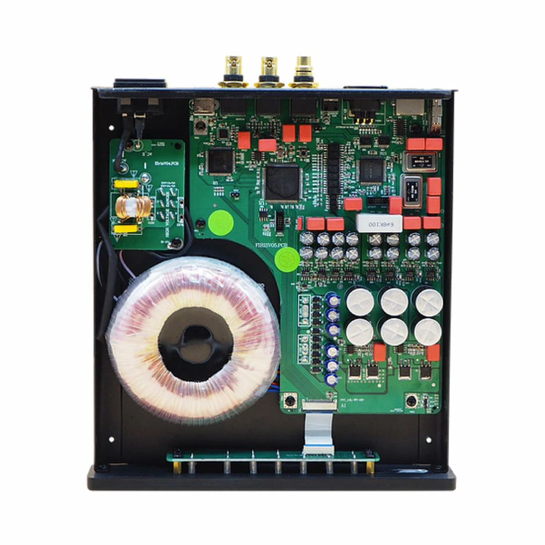 Denafrips IRIS employs a total of 8 sets of Ultra Low Noise, Precision Linear Power Regulars, along with oversized O-Core Transformers. This delivers clean power to the digital circuit effortlessly. These USB digital signal data-stream will be FIFO buffered and reclocked via the FEMTO Crystal Oscillator. This process eliminates the jitter to a negligible level, ensuring the digital output signal is free from harmful jitter noise.