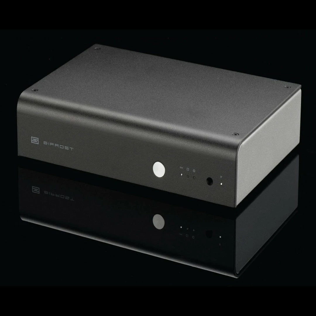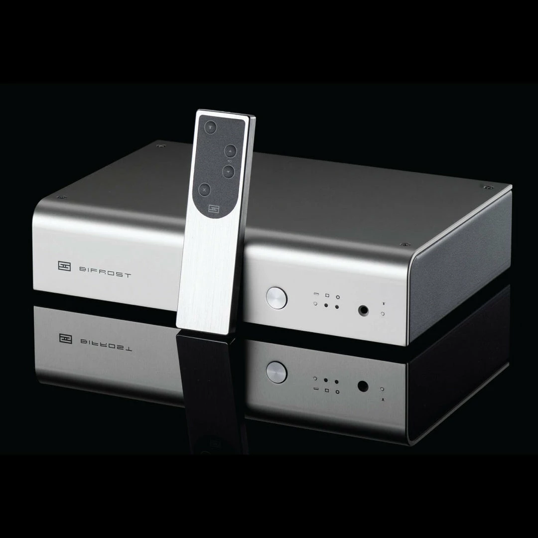 The Bifrost 2 comes with multiple input & output options. A unique Unison USB offers the best performance with minimum power consumption thanks to its precision local clocks, PIC32 microprocessor and electrostatic & electromagnetic isolation. It also features an XLR balanced output and RCA single output. It comes with a milled aluminium remote control that allows you to choose from various options including inputs, mute and change phase.