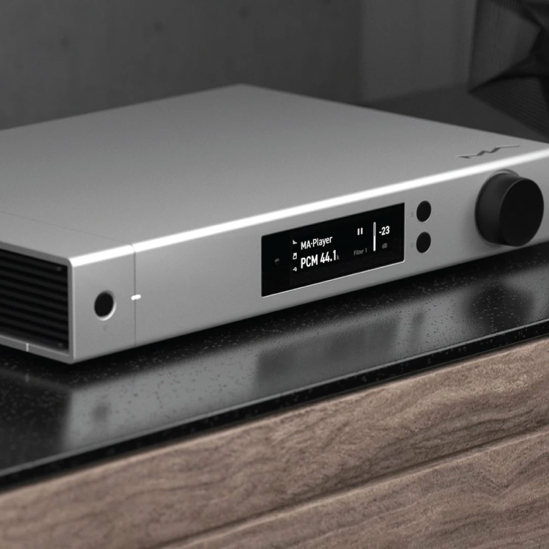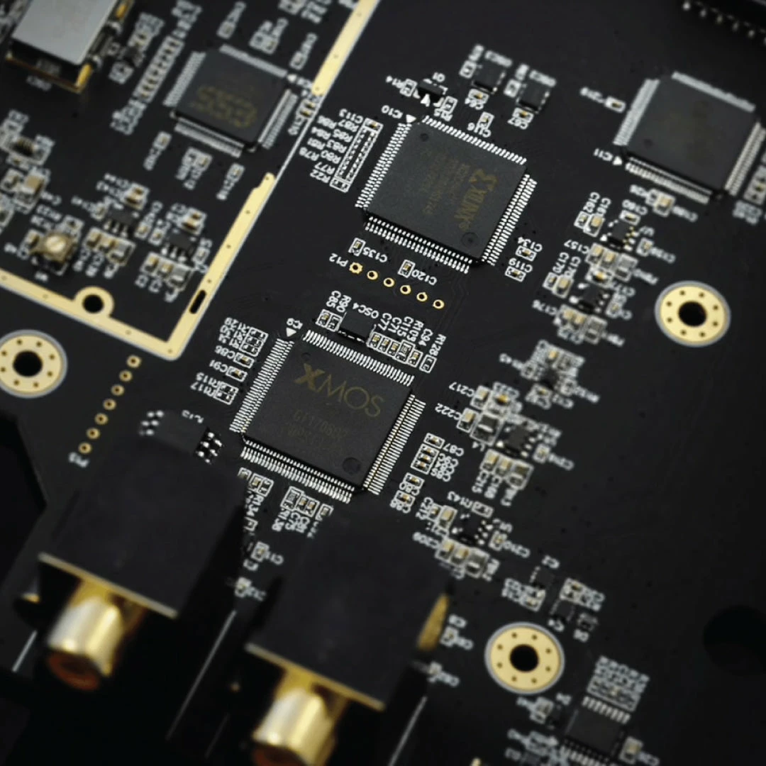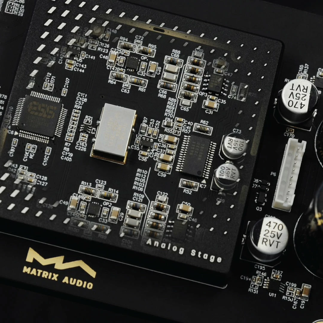 The XMOS XU216 USB Interface feeds the audio signal to the ESS ES9028PRO DAC and Crystek CCHD-950 ultra-low phase noise femtosecond clock for high-res jitter-free sound. To keep the audio quality from degrading, a MUSES72320 resistor for the analogue volume control is used. The element P supports MQA technology to decode Master Quality Authenticated files and playback the sound of the original master recording.