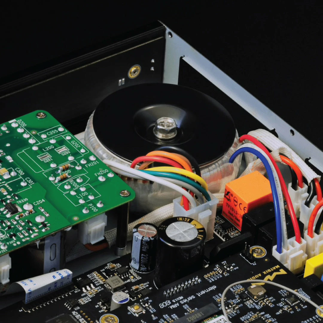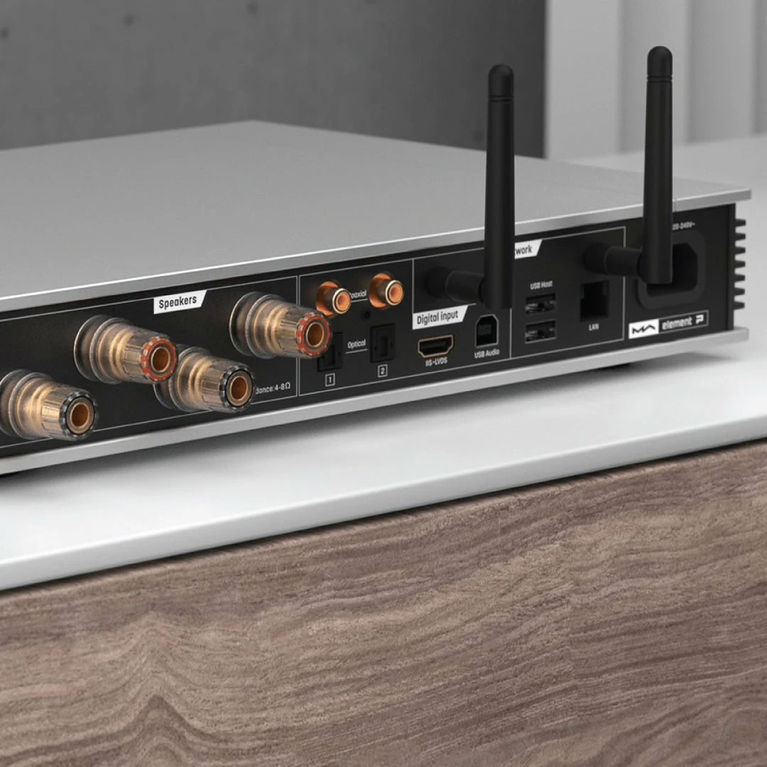 The element P is the first Streamer from Matrix Audio that features a full-featured audio source. The Linux-based audio system uses a Freescale i.MX6 series dual-core ARM processor. The core power amplifier is the Danish ICEpower 250ASX2 class-D amplifier module that offers an output of 230 Watts per channel @ 4ฮฉ. To prevent the superimposed noise in the moduleโs power supply from entering the pre-amp section, a front-end linear power supply is used. This consists of a multi-channel linear LDO with Nichicon audio-grade capacitors and a customised Noratel toroidal transformer.