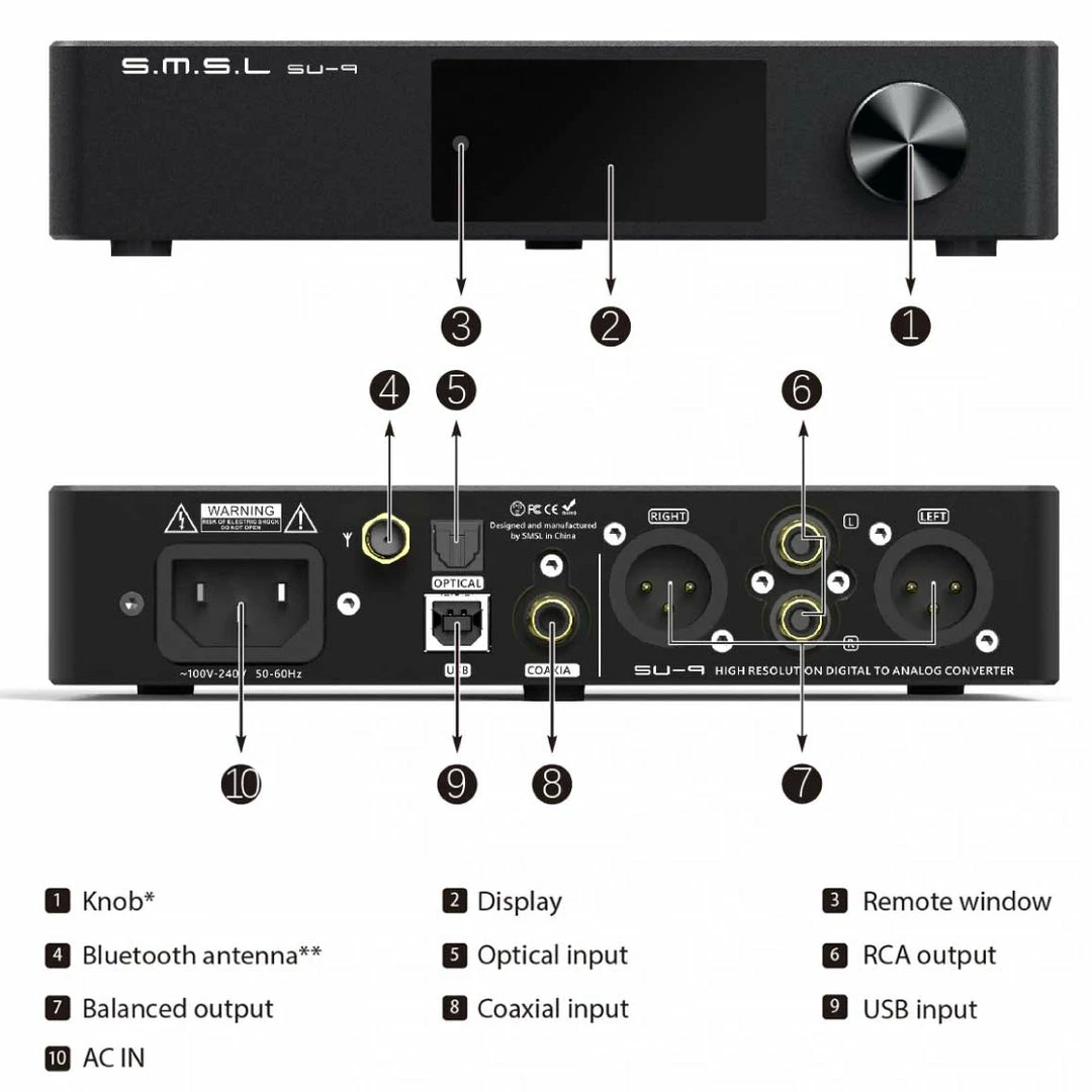 Paired with a volume knob, display and a remote the SMSL SU-9 makes it easy for you to manage your music. It also takes care of connection needs with a range of audio inputs including Bluetooth, USB, AC IN, Coaxial and Optical inputs. It also has an RCA output and a 3-Pin XLR balanced output.