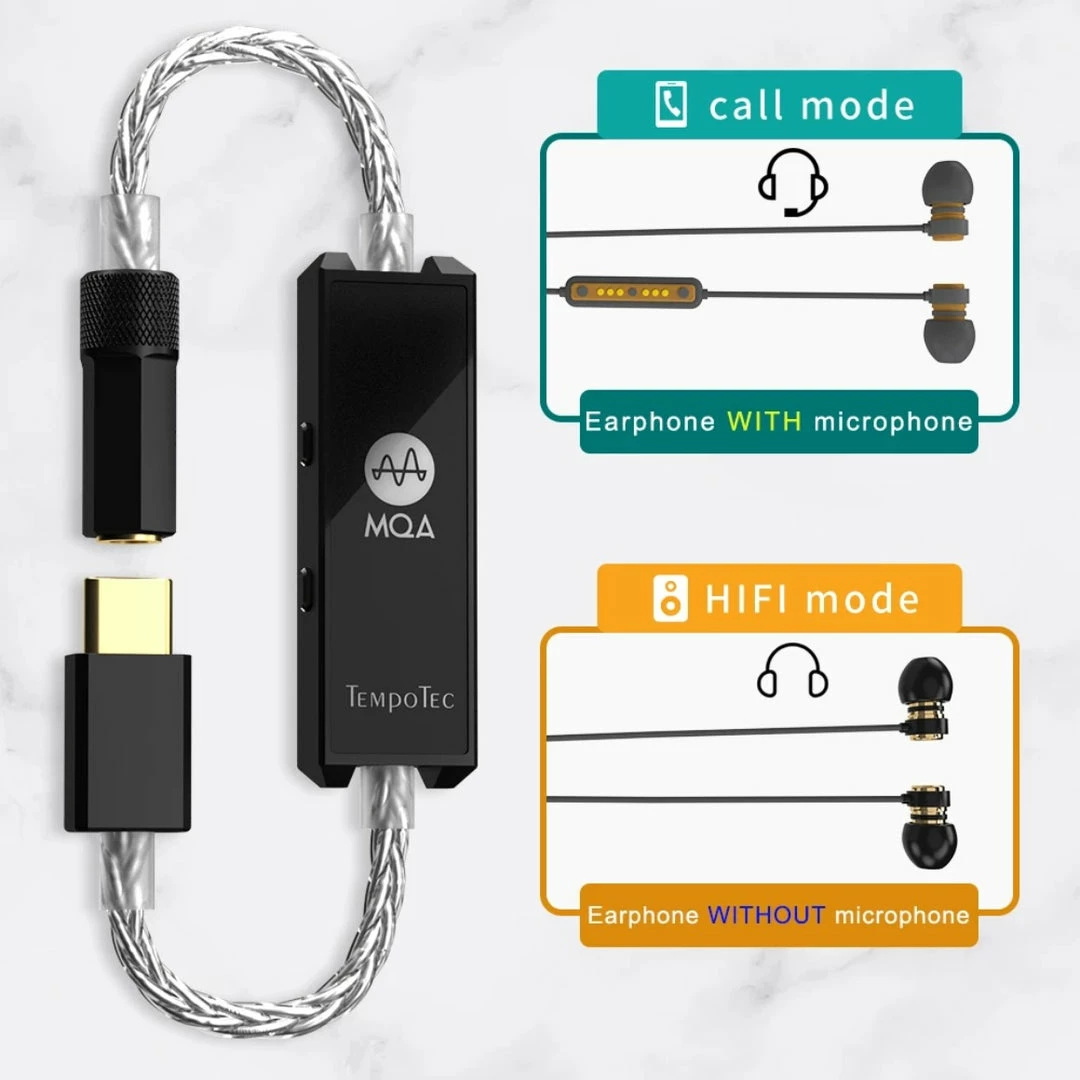 TempoTec Sonata MHD offers two unique modes of operation depending on the connection established. Call Mode activates when you connect an earphone equipped with a microphone, allowing you to communicate with ease. The HiFi Mode activates when earphones without a microphone are connected, allowing you to enjoy music at the highest quality possible. The switching between these modes happens automatically. The Sonata MHD also comes equipped with a single crystal copper wire that is silver plated to reduce signal loss during transmission.