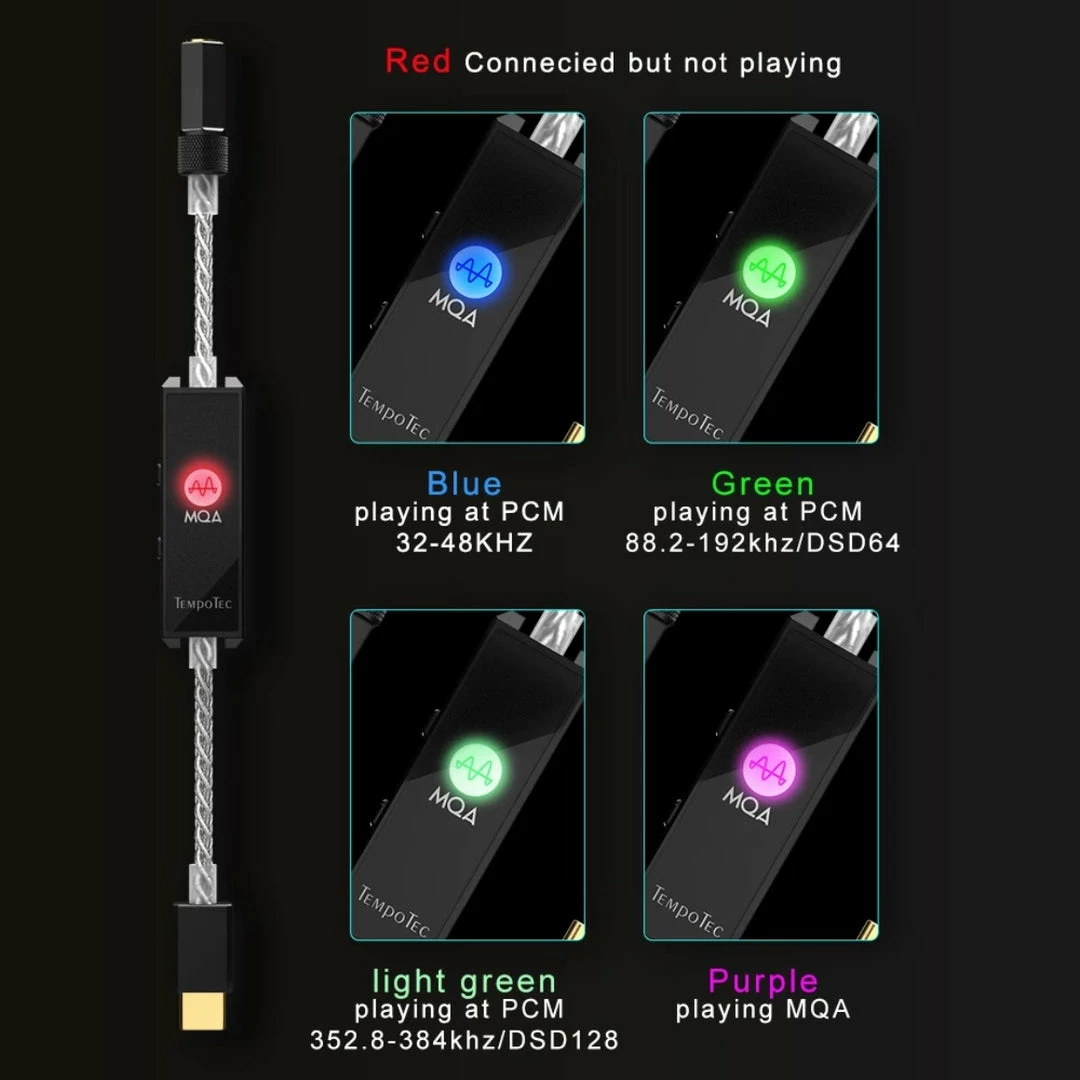 The indicator light comes up in different colours according to the currently playing music format / sample rate. Red: connected but not playing, Blue: playing PCM at 32-48kHz, Green: playing PCM at 88.2-192kHz / DSD64, Light green: playing PCM at 352.8-384kHz / DSD128, Purple: playing MQA