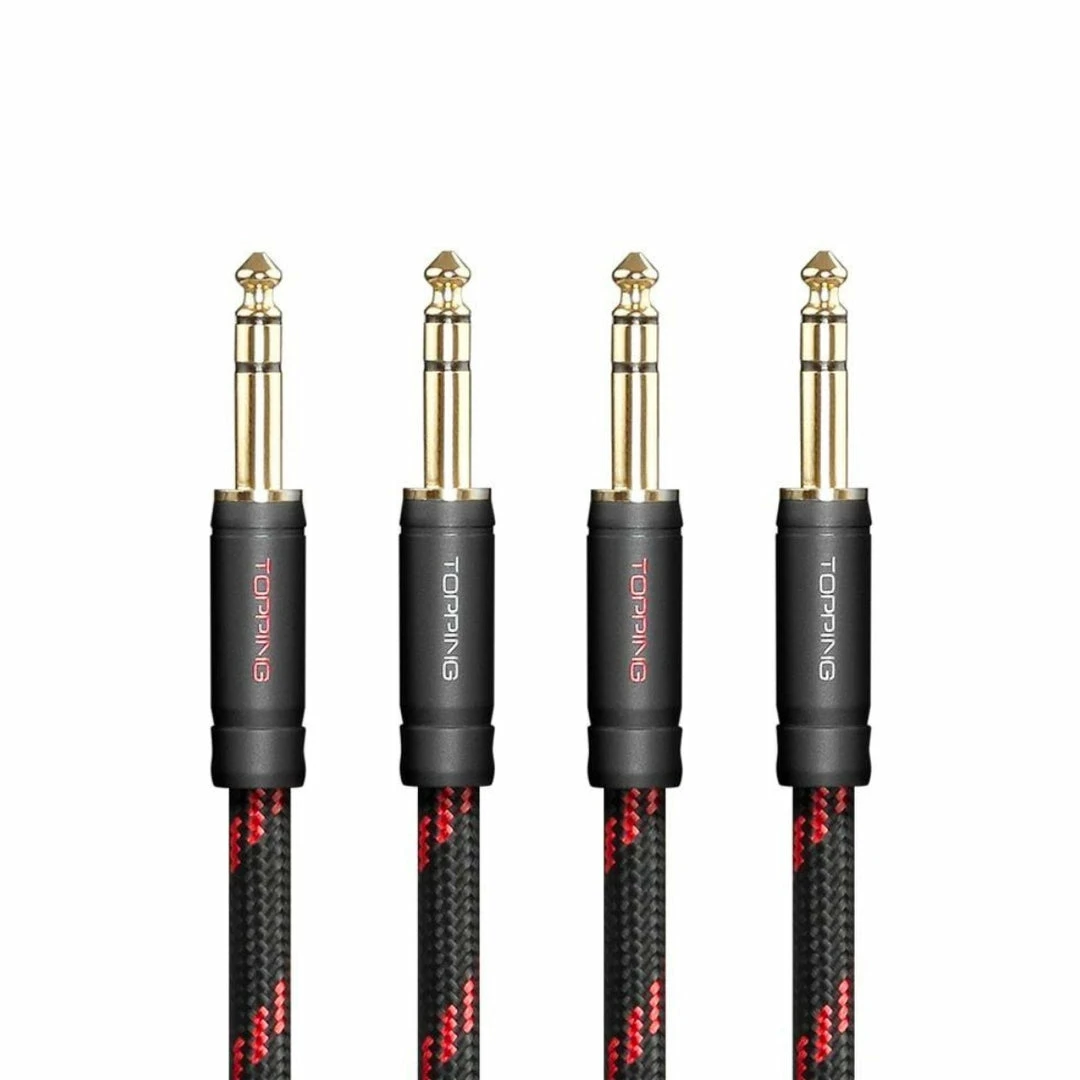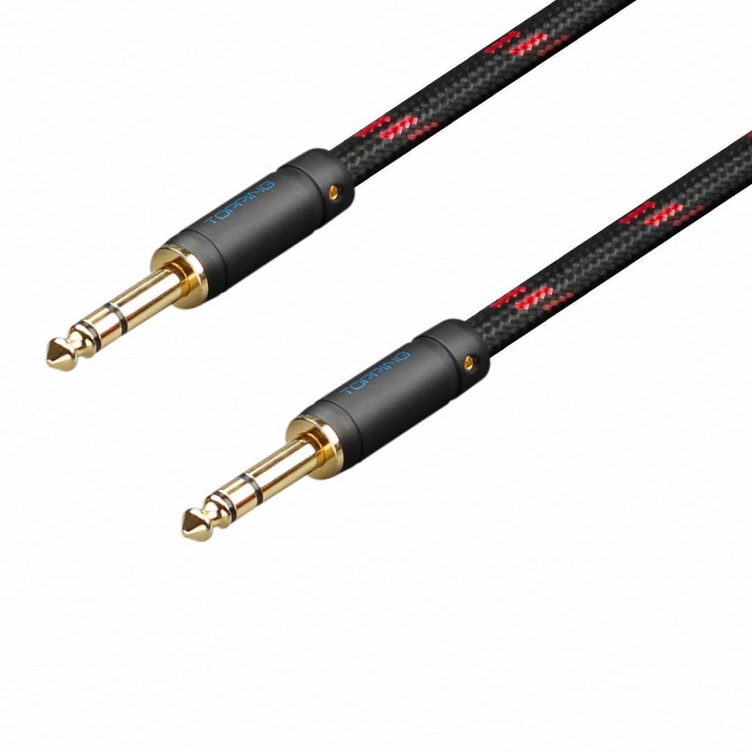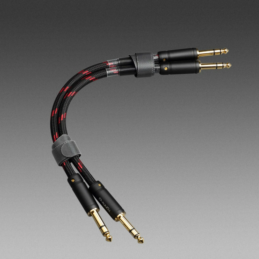 The Topping TCT1 cable offers a high-quality solution to connecting your audio devices and achieving perfect signal transmission. The TCT1 integrates 6N copper and 6N silver-plated copper conductors to achieve flawless transmission of audio. Each conductor in the cable has a section of 0.533mm² (19AWG), and the contacts of the connectors are gold plated to maintain an excellent conductivity while ensuring oxidation resistance. Each cable is coated with a beautiful and robust black and red braided nylon jacket. This cable features Balanced 6.35mm TRS connectors on both ends. In the package, you will receive a velcro for cable management and you will find two individual audio cables that are colour coded for the left and right sides.