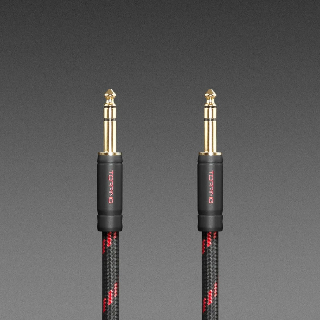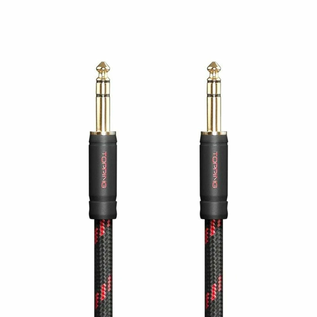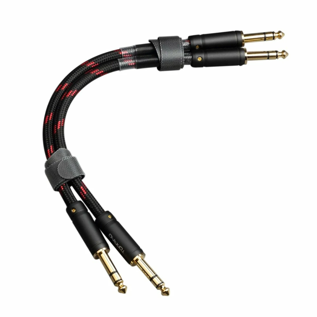 The Topping TCT1 cable offers a high-quality solution to connecting your audio devices and achieving perfect signal transmission. The TCT1 integrates 6N copper and 6N silver-plated copper conductors to achieve flawless transmission of audio. Each conductor in the cable has a section of 0.533mm² (19AWG), and the contacts of the connectors are gold plated to maintain an excellent conductivity while ensuring oxidation resistance. Each cable is coated with a beautiful and robust black and red braided nylon jacket. This cable features Balanced 6.35mm TRS connectors on both ends. In the package, you will receive a velcro for cable management and you will find two individual audio cables that are colour coded for the left and right sides.